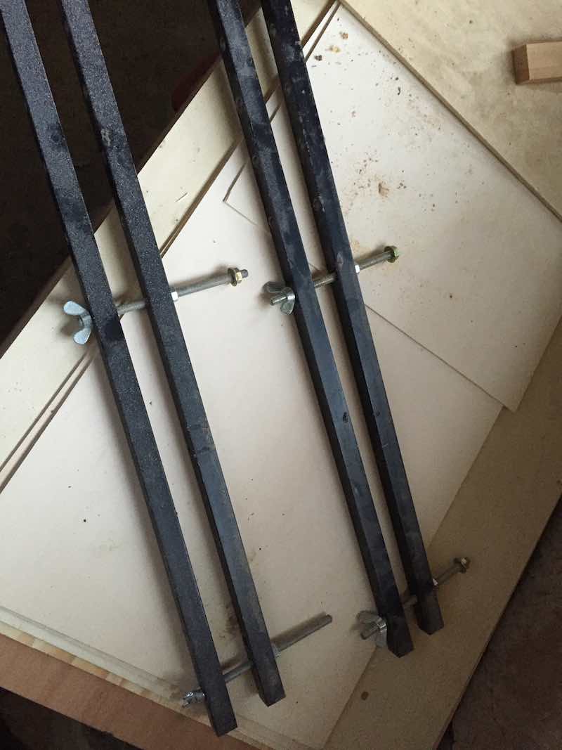 Ein paar lange Schrauben mit Flügelmutter zum Spannen auf die Materialstärke, Leim an das Holz und mit Schraubzwingen die Hölzer zusammen drücken.