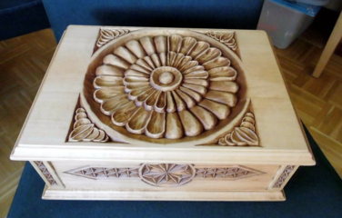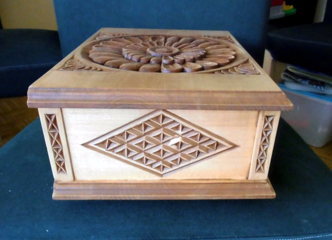 Die Schatulle habe ich komplett aus Lindenholz gefertigt,die Muster der Seiten-Vorder und Rückwand habe ich selbst entworfen und das Reliefmuster auf dem Deckel habe ich in dem Buch "Ornamentales schnitzen" gesehen allerdings nur auf einem Foto. Das konstruieren des Musters auf meine Größe hat mir doch einiges abverlangt aber letztendlich habe ich doch alles ohne Computer und Programme nur mit Bleistift,Zirkel und Lineal hingekriegt.