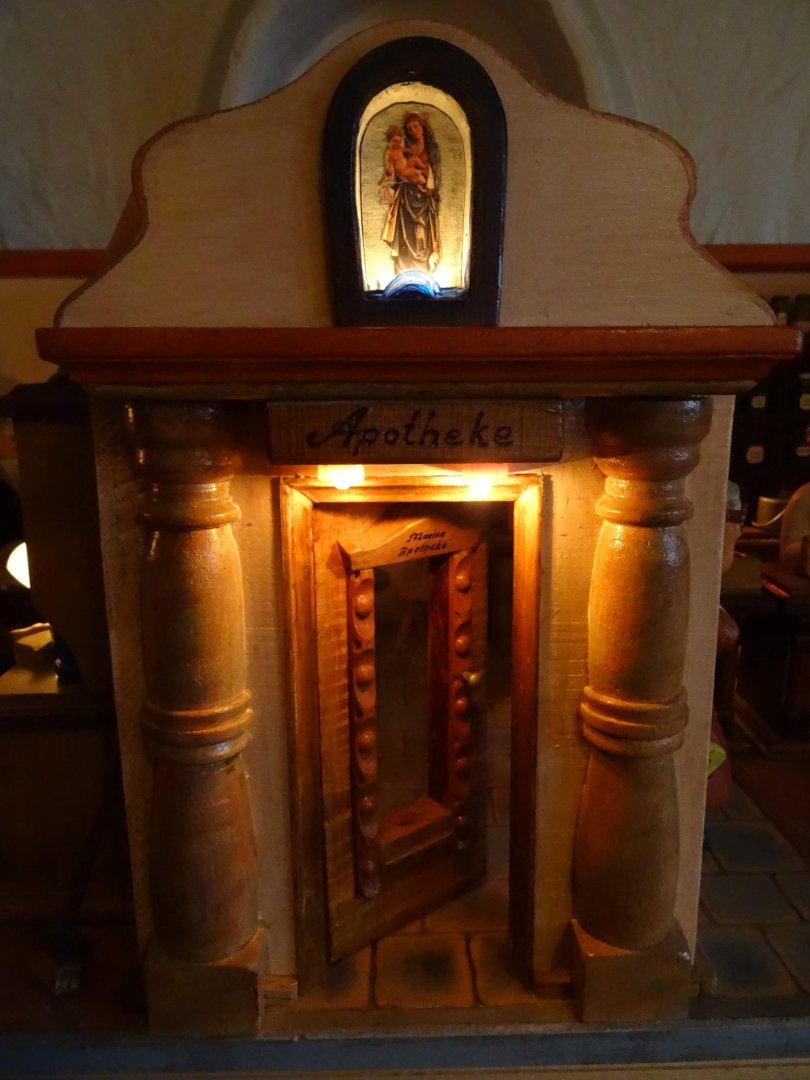 Deine Apotheke ( ich hab mal gezielt danach gesucht) hast du im Dezember 2019 hier vorgestellt. Ob da schon Licht einschalten möglich was weiß ich nicht. Es ist immer wieder erstaunlich was du so alles filigranen schon hergestellt hast. Das schau man sich gerne wieder an.