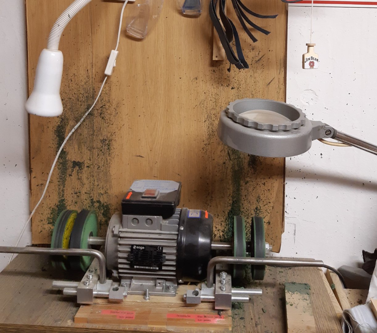 Schleifpapier an , dann trage ich die grüne Schleifpaste auf. Alles bei dreheden Scheiben.