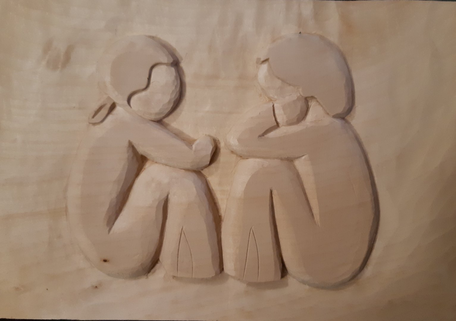 Beim Jungen wird das Gesicht durch die Hand verdeckt. Es bietet sich bei dem Mädchen mit dem runden Kugel Kopf geradezu an. Ich würde dir daher mal empfehlen, nur den oberen Teil des Mädchens noch mal auf einem Reststück nachzuschnitzen und dann ein keines Gesicht zu probieren. Wenn du das hast mache ich eine Kopie und zeige dir dann wie ich es machen würde da dieses Motiv doch sehr abstrakt gehalten ist.