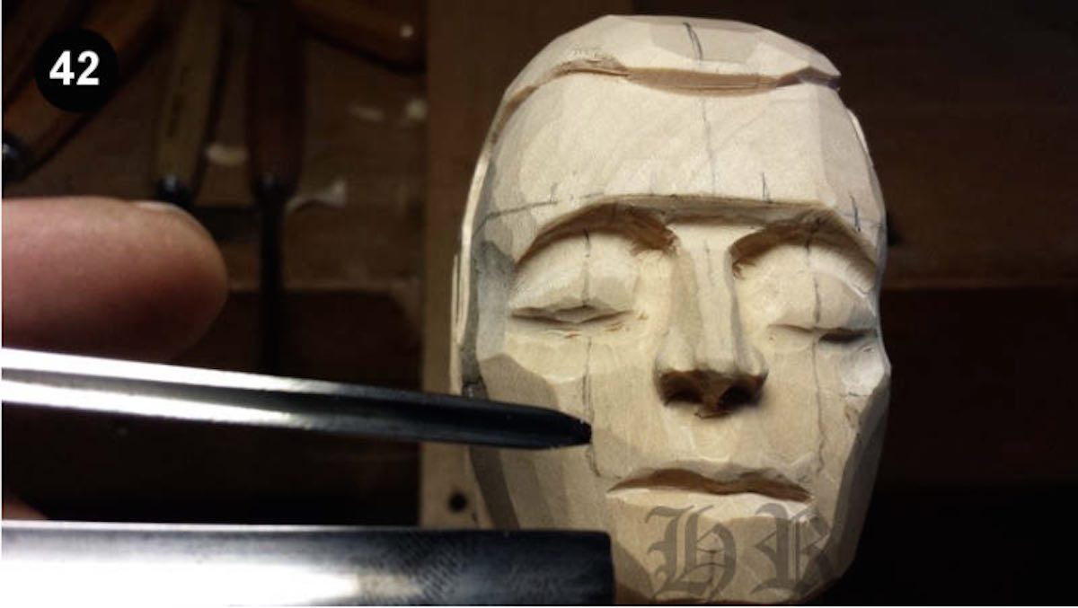 Mit einem Geißfuß 90 Grad wird nun der Mundspalt geschnitten. Hierbei wird jeweils von außen nur bis zur Mitte geschnitten. Mit einem spitzen Geißfuß 3/15 und einem schalen 3 / 10 werden die Lippen entsprechend geformt wie ich im Bild 42 zeige.