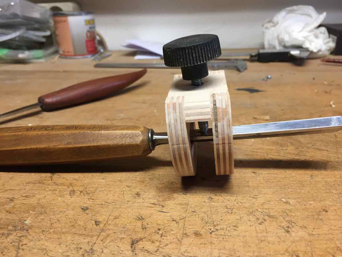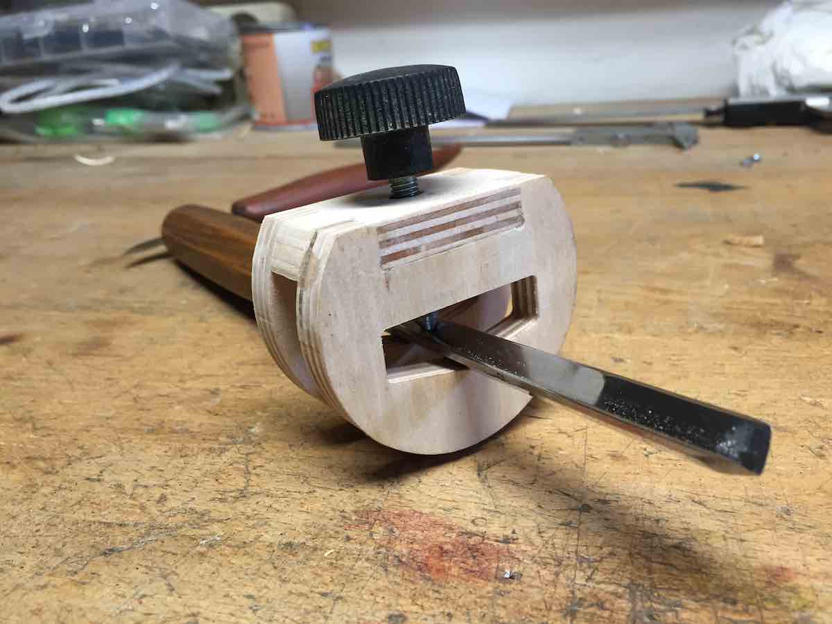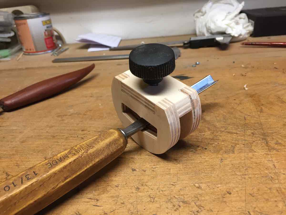 Damit du den richtigen Winkel einstellen kannst, ist es zweckmäßig dem Werkzeug einen Anschlag zu geben. So kann das Eisen jederzeit abgesetzt und wieder aufgelegt werden, ohne das sich der Winkel verändert.