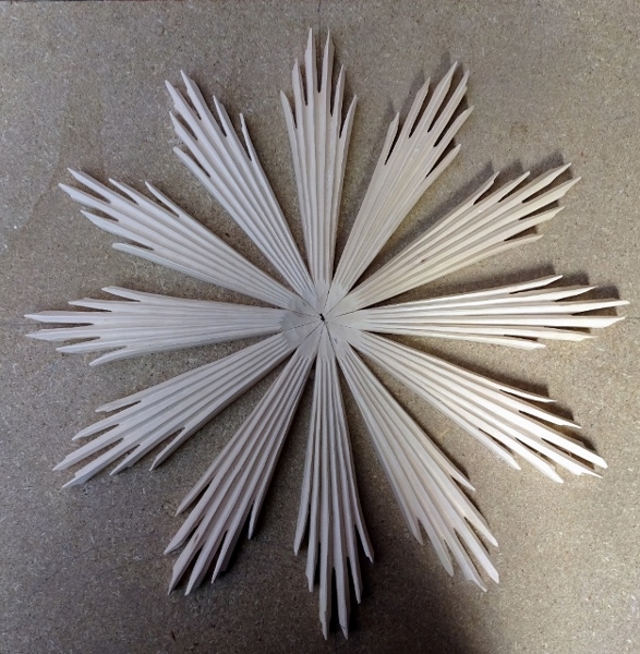 Die Strahlen wurden einzeln angefertigt um dem Faserverlauf längs der Strahlen zu schnitzen. Die Strahlen wurden mit der Bandsäge vorgeschnitten. Sämtliche Flächen wurden aber nachgeschnitzt. Wie seht habe ich die einzelnen Strahlen dann auf einer Holzplatte zusammen geleimt.