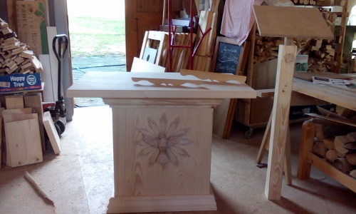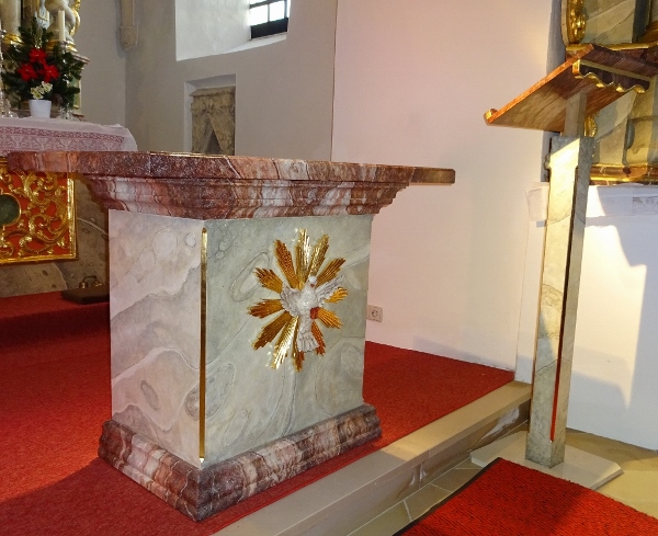 Hier noch ein paar Bilder. Rechts seht Ihr das passende Ambo, welches auch von uns gefertigt wurde.