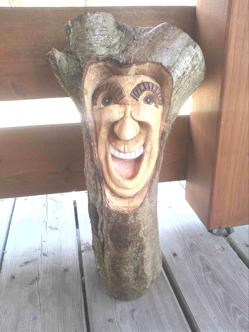 Die Idee ist aus einem Buch für Schnitzanfäger. Beim Schnitzen ist mir die Rinde für eine Augenbraue abgefallen. Etwas Weißleim und dann war sie wieder dran. Das Material, ein Teil eines Kiefernstammes.