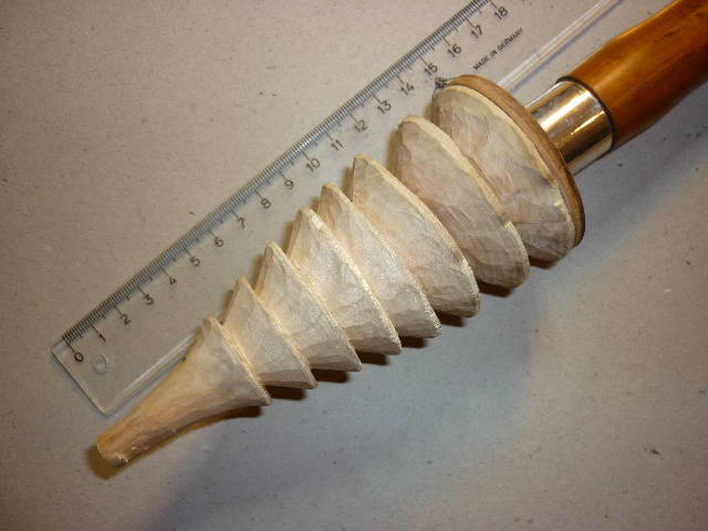 Nun, ob nun vorgedrechselt oder geschnitzt ist eine Ansichtssache. Beim Schnitzen des Grundkörpers muss halt das Eisen groß genug sein, dann nimmt es sich zeitlich nichts. Es ist jedoch leider eine Tatsache, das in den Werkzeugtaschen der Hobbyschnitzer sich nur wenige große Eisen befinden und man somit weitaus länger an einem Grundkörper schnitzt.