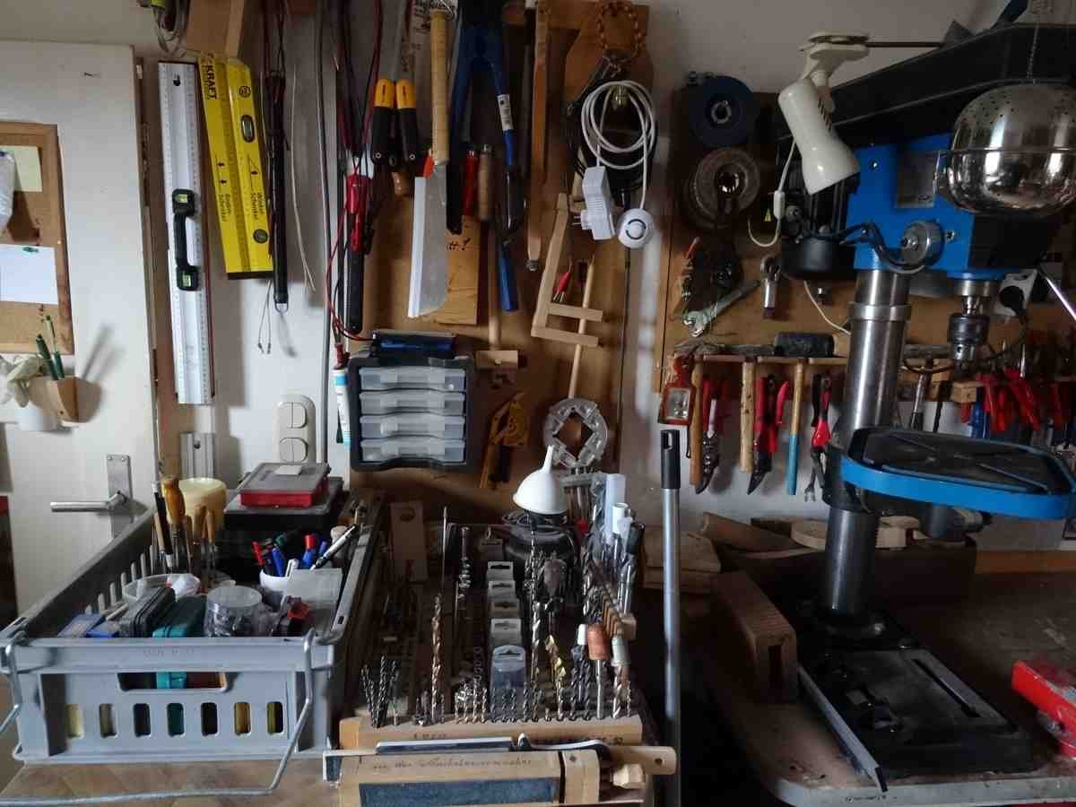 anders aus , nachdem ich mehr Werkzeug brauche , als nur Schnitzmesser und das Drumherum zum Schnitzen , benötige ich jeden freien Platz in meinen Hobbyräumen um den ganzen Kram unterzubringen und was man auf den Bilder nicht sieht , steht unten in den Blechschränken und der Rest auch in der Scheune .