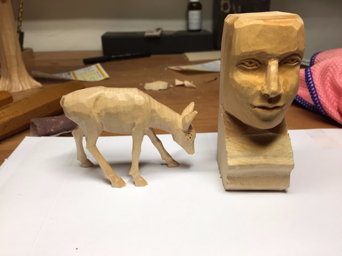 Ob es mit dem Wachs zusammenhängt, kann ich vorerst noch nicht beurteilen. Zum Vergleich hier mal ein Foto. Achtet dabei nicht auf das Geschnitzte, denn der „Kopf“stimmt ohnehin nicht und ist nur ein Probestück, sondern nur auf den Farbton des Holzes der beiden Schnitzereien. Ich hoffe, das die Aufnahme, mit dem Handy doch halbwegs passt.
