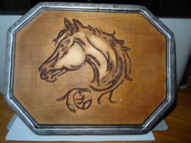 Das Bild habe ich mit dem elektrischen Schnitzmesser auf die Schnelle herausgearbeitet , In der Tiefe wurde es mit Antikwachs / dunkel eingelassen und mit der Heißluftpistole fixiert. Der Rand ist mit der Oberfräse entstanden und die oxidierte , alte Fassung vom Rahmen - naja - ein wenig " Silberpulver " in Klarlack eingerührt nach der Trocknung (1/2 - Std. ) mit schwarzer Trockenfarbe dunkler abgetönt und mit einem alten Stück Frottetuch über ein Holzbrettchen angetupft , auf den hellen Silberrahmen aufgestupst ; das war's dann aber auch schon , so einfach geht es einen alten oxidierten Siberrahmen in ein paar Minuten herzustellen . Die Backen vom Pferdekopf habe ich wieder ein wenig herausgerieben , so kommt der Kopf plastischer heraus .