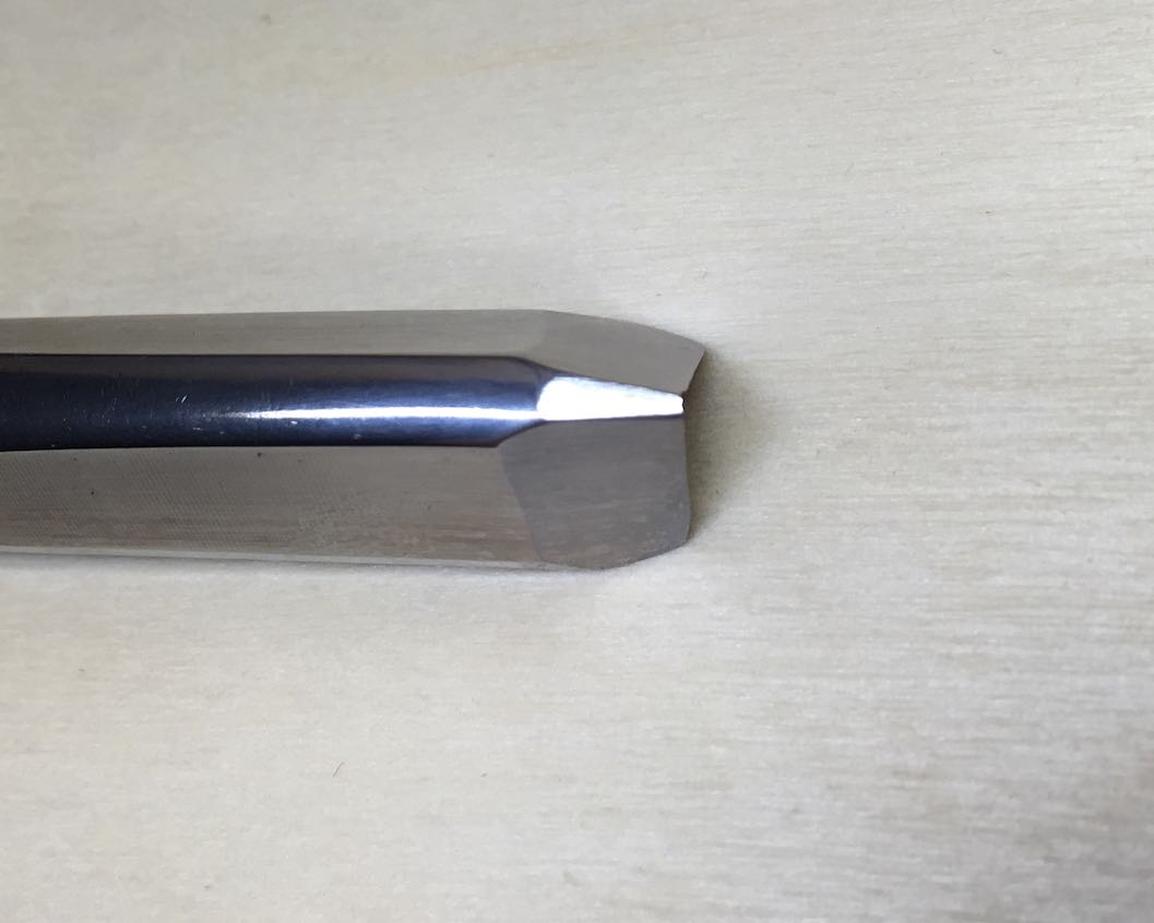Wie ihr wisst, wenden alle Hersteller eigne Verfahren zu Herstellung der Werkzeuge an. Es genügt also erst mal ein prüfender Blick auf die Schneide eures Werkzeuges, bevor man überhaupt mit dem Schleifen beginnt. Zur Anschauung habe ich mal einen Geißfuß der Marke Pfeil verwendet.