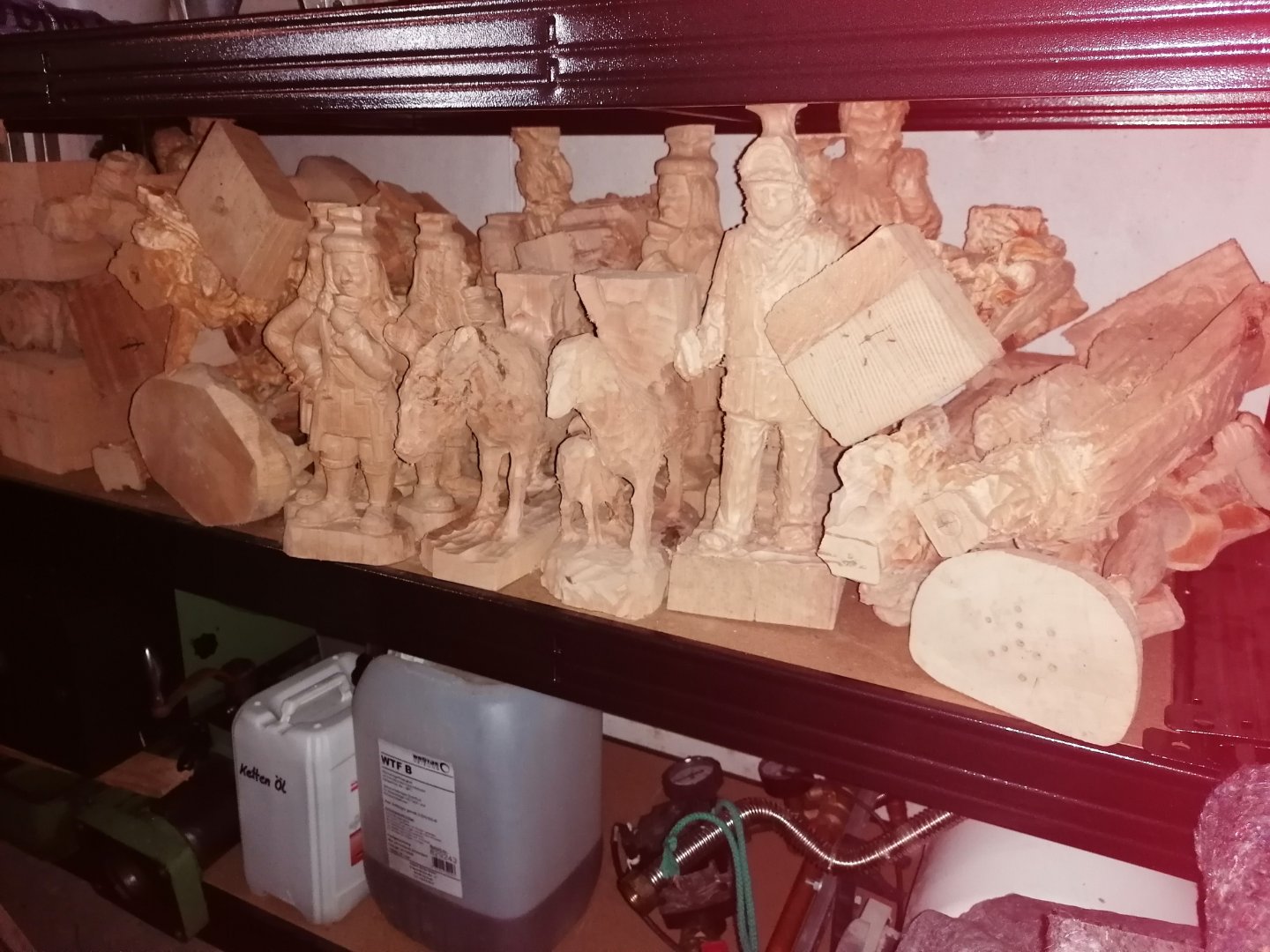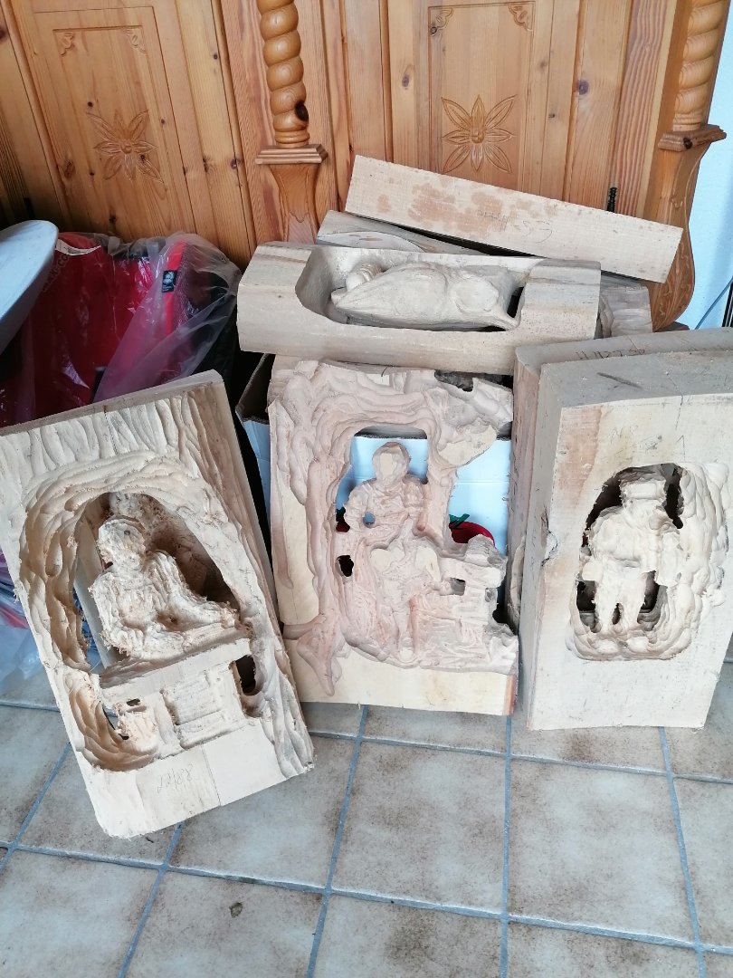 Ich konnte nicht wieder stehen. Im Nachbarort hat ein Schnitzer ( er schnitzt jetzt nur noch fastnacht Masken) sich von all seinen Rohlingen getrennt. Mittwoch hohle ich die restlichen mit dem Anhänger. Es sind weit über 100 Teile. Reliefs kommen auch noch hinzu. Ich habe für die Rohlinge, ich kann es noch gar nicht glauben, nur 100€ bezahlt. Sogar welche aus Weymouth Kiefer sind mit dabei.