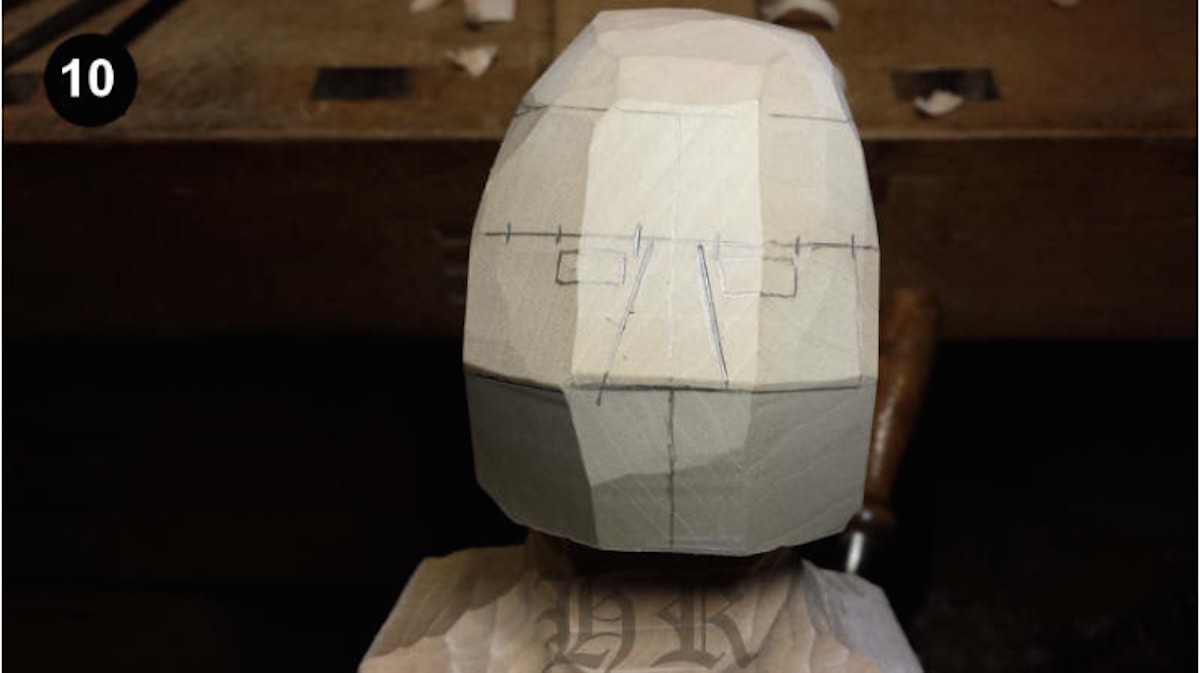 Als erstes wird die Position der Ohren eingezeichnet und an den Seiten gerade nach hinten das Material entfern bis dahin wo die Koteletten zum Ohr beginnen. Anschließend habe ich mit einem Stich 2/ 30mm, welches ich verkehrt herum genommen habe, die beiden Schrägen von der Nasenspitze nach oben im Gesicht angelegt, die einen Winkel von ca. 45 Grad Zur Gesichtsfront entsprechen. Das gleiche wird dann von der Nasenspitze nach unten gemacht. So entstehen 6 gleich breite Flächen innerhalb des Gesichtes Bild 7u. 8. Nicht vergessen, die weggeschnittenen Hilfslinien wieder miteinander zu verbinden. Diese Schnitte macht man nun über den gesamten Kopf, wobei man im Bereich des Haaransatzes an den Seiten auch etwas wegnimmt Bild 9 .