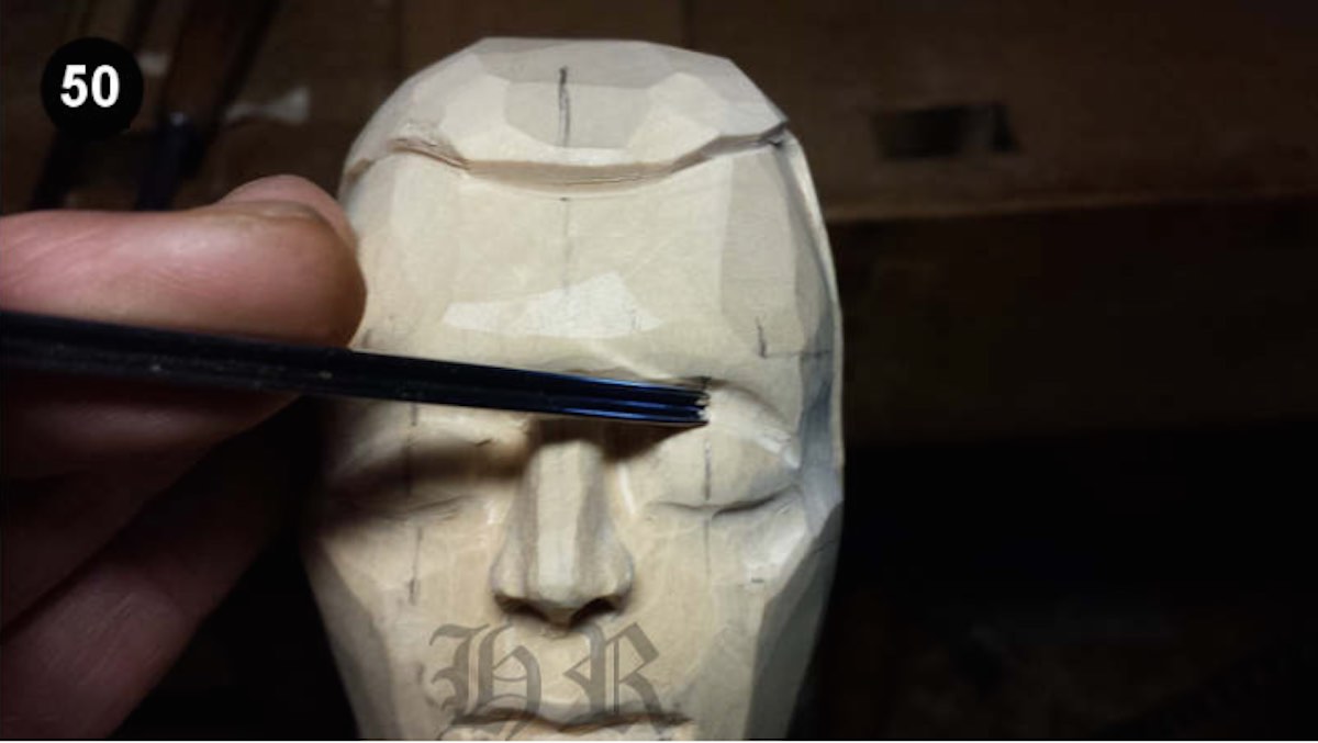 Mit einem Eisen Stich 7/30 habe ich an beiden Seiten die Schläfen rausgeschnitten Bild 15, die an den Koteletten auslaufen. Das ist wichtig, da diese beiden Schnitte gleichzeitig das Jochbein an der unteren Schnitzkante markiert.