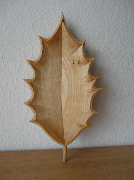 vor einiger Zeit habe ich eine Weinblattschale geschnitzt und in diesem Zusammenhang ist mir die Idee gekommen, einer Schale die Form eines Stechpalmenblattes zu geben.