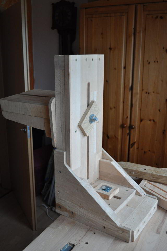 den Schnitzwinkel befestige ich mit einer 12er Schraube durch ein entsprechendes Loch in der Tischplatte.