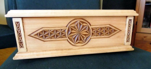 Die Schatulle habe ich komplett aus Lindenholz gefertigt,die Muster der Seiten-Vorder und Rückwand habe ich selbst entworfen und das Reliefmuster auf dem Deckel habe ich in dem Buch "Ornamentales schnitzen" gesehen allerdings nur auf einem Foto. Das konstruieren des Musters auf meine Größe hat mir doch einiges abverlangt aber letztendlich habe ich doch alles ohne Computer und Programme nur mit Bleistift,Zirkel und Lineal hingekriegt.