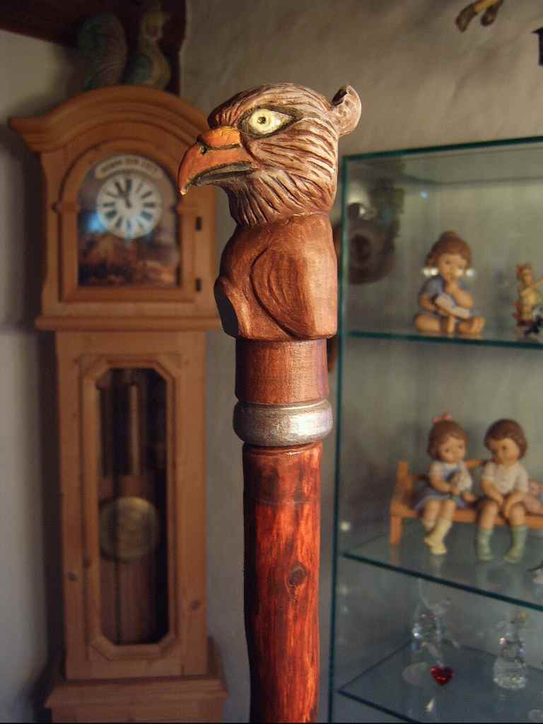 Der Stecken ist aus Nadelholz , den Adlerkopf ( oder auch komischer Vogel ) habe ich aus Weichholz " frei weg "