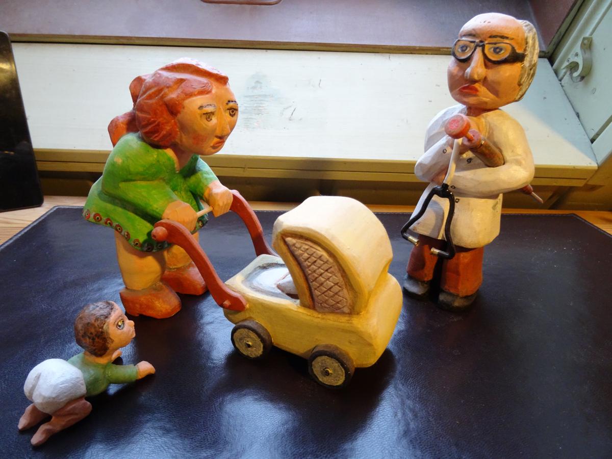 Wenn ich wieder mal mehr Zeit habe , werde ich sie mal fertigschnitzen und bemalen - es sollten mal Figuren für eine kleine Spielburg werden - der König mit Frau , ein Bauer , der gerade seinen 10 ten Teil abliefert ,