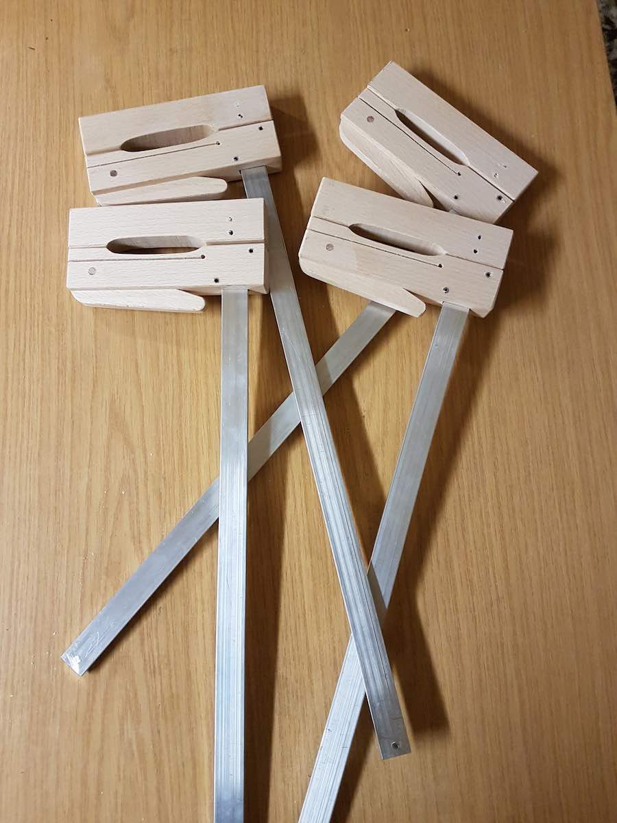 nun habe ich etwas Zeit gehabt und mir noch mal ein paar Schnellspannzwingen gebaut. Zwei Stangen Aluflachmaterial 5 X 20 X 100 habe ich geteilt und mir daraus die 4 Zwingen gefertigt.