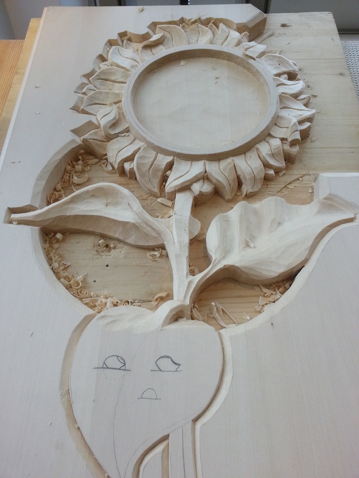 Ich wollte ein Relief schnitzen. Eine Sonnenblumenuhr.