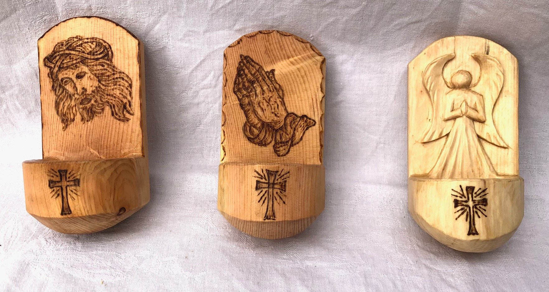 Habe Weihwasserkessel aus Zirbenholz geschnitzt. Linke 2 sind noch zusätzlich mit Brandmalerei.