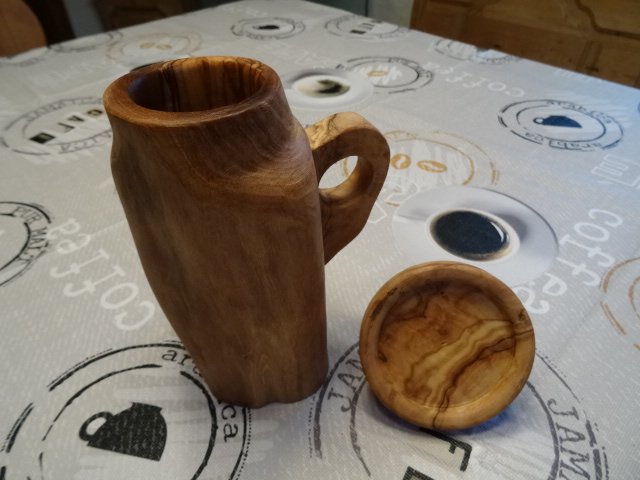 in der Nähe von Rom Olivenhaine - dort hat mal jemand Feuer geschürt und es sind einige Bäume dadurch beschädigt . Für Freundschaftsdienste hat er mir diese Stämme mitgebracht , wenn er sie immer in Italien besucht hat. Ein Gefäß mit abnehmbaren Deckel " natur " - wie gewachsen , habe ich so auf die Schnelle gebastelt und mit Holzöl eingelassen ( man sieht es noch teilweise am Glanz - ist noch nicht ganz trocken )