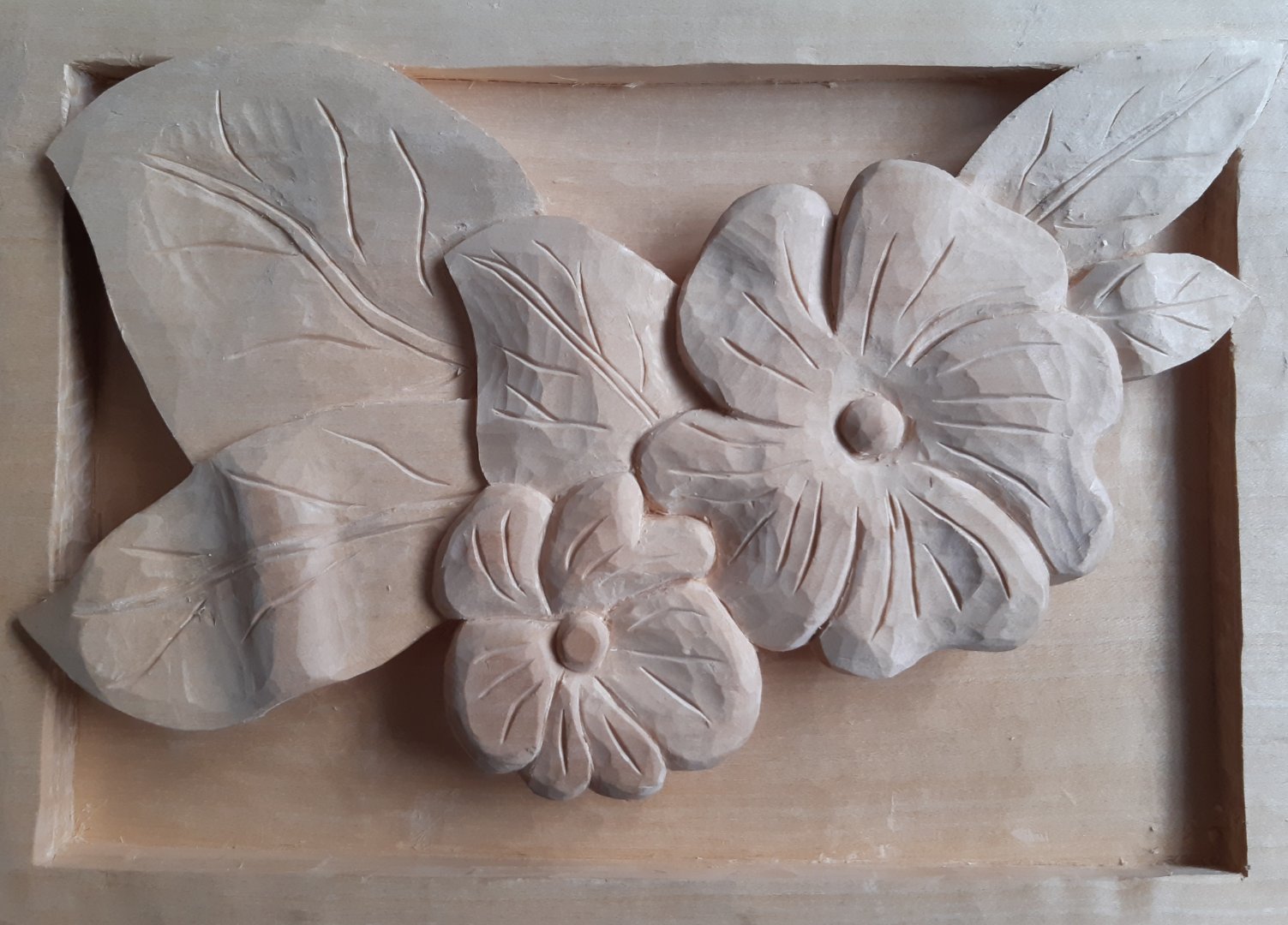 Den Rahmen musste ich flacher schnitzen, ich kam mit meinen verschiedenen Schnitzeisen nicht weit genug unter die Blumen und Blätter .Mit dem Dremel ging nichts, alles geschnitzt. Die Grundplatte möchte ich punzieren,. Am schwierigsten waren die kleinen Hinterschneidungen