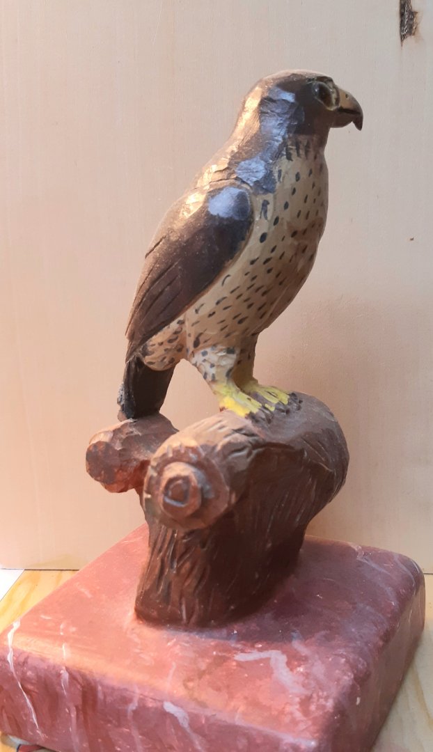 Die Anregung jetzt einen Vogel auf einem Ast zu schnitzen ist schon von mir umgesetzt worden. So einen Specht am Baumstamm habe ich schon im Regal stehen. Auch einen Wanderfalken habe ich aus dem vollen Holz schon hergestellt.