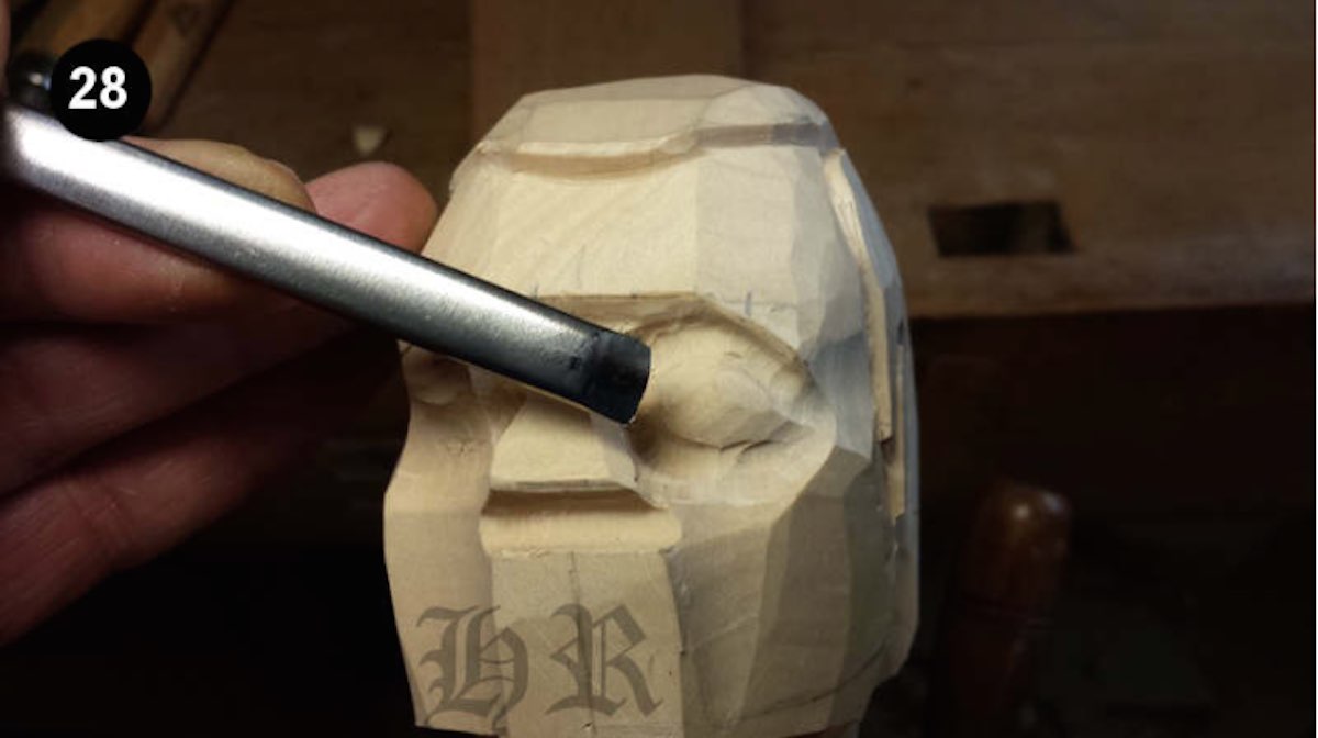 Im Bild 31 wird nun die vorgeschnittene Hohlkehle unterhalb der Nase vergrößert. Hierzu habe ich das gleiche Eisen für das Schneiden der unteren Augenlieder verwendet (9/10). Dieser Schnitt erfolgt in einem leichten Radius wie eingezeichnet.