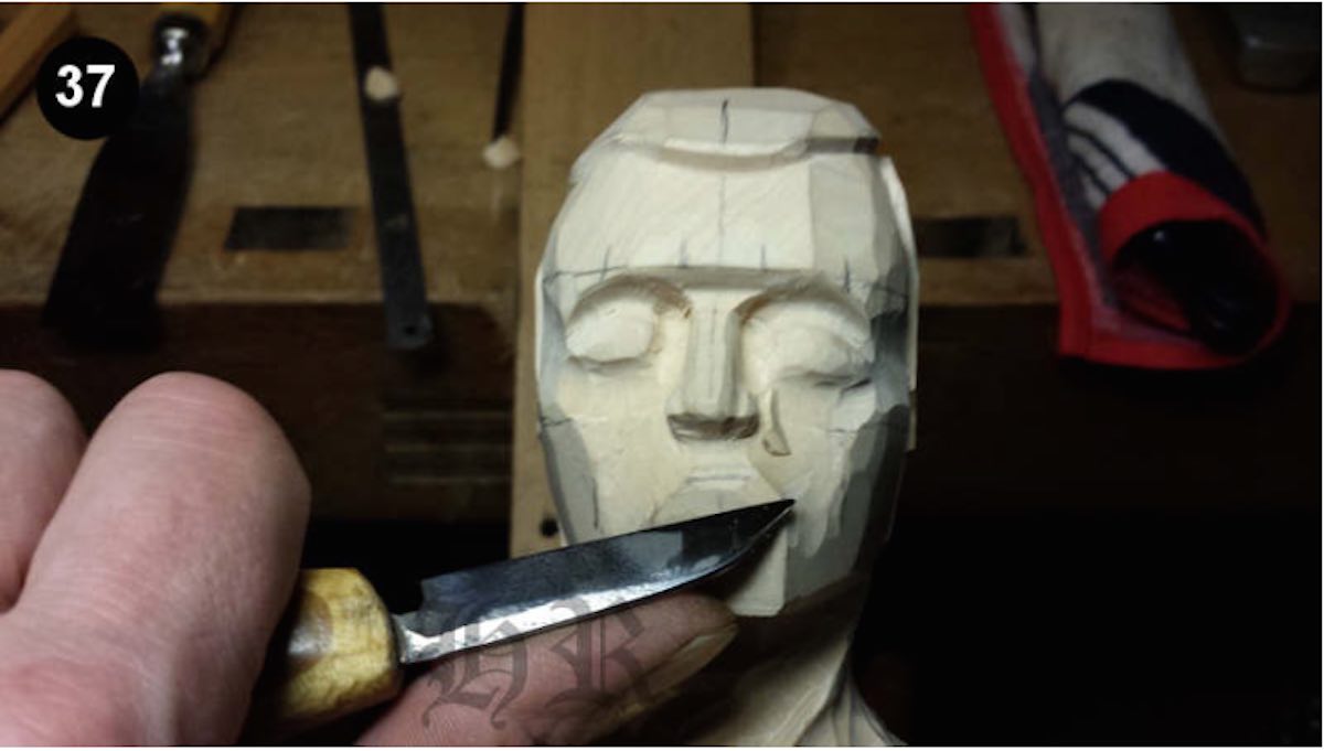 Auf der rechten Seite im Bild 36 ist die Linienführung zu sehen. Mit einem Rosenmesser oder einem Stich 2 der verkehrt verwendet wird, wie im Bild 37 u. 38 kann nun der Mundbereich schön rundlich geformt werden.