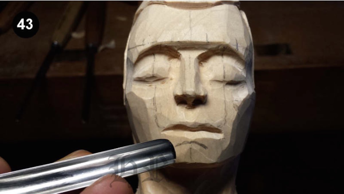 Mit einem Geißfuß 90 Grad wird nun der Mundspalt geschnitten. Hierbei wird jeweils von außen nur bis zur Mitte geschnitten. Mit einem spitzen Geißfuß 3/15 und einem schalen 3 / 10 werden die Lippen entsprechend geformt wie ich im Bild 42 zeige.