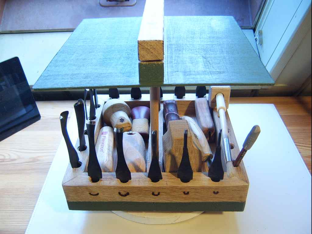 Obenauf ist ein Tragegriff , im Deckel ist ein kleiner Magnet eingelassen der den Schutzdeckel dann oben hält , solange ich damit arbeite . Nur ein leichtes antasten und das Karussell dreht sich . Ich kann dann seitlich hinlangen und die Klingen nehmen. Im Boden habe ich verschiedene selbstgemachte Griffe liegen , die ich vor einer Schnitzaktion herauslege . Ein kleiner , beweglicher und steckbarer Pinselhalter ist auch eingebaut .