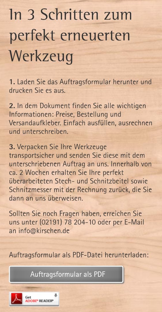 Jetzt meine Frage an euch. Hat jemand Erfahrung mit dem Nachschleifservice von Kirschen? Ich nöchte meine Messer dort nachschleifen lassen. Als Anhang mal