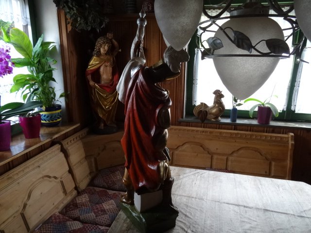 vollstellen . Die kleinere Figur ist für mich noch hinzubekommen , da benötige ich keine Abbildungen . Die Figur hat mir eine Bürgerin geschenkt , sie hat sie jahrelang immer bei einem katholischen Fest ( ? ) auf einem Tisch vor die Haustüre gestellt , da auch viele im Dorf große Kreuze vor dem Haus stehen haben ; dort sind dann einige katholischen Bürger vom Dorf mit dem Pfarrer entlang gelaufen .