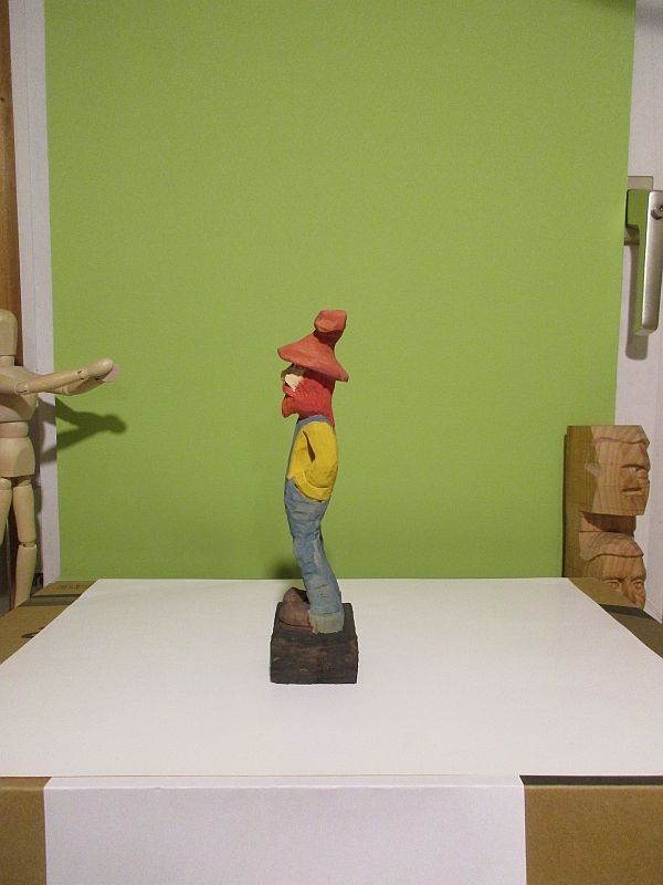 nach Delmer 1 nun Delmer 2. Ich schnitze oft, vor allem wenn ich längere Zeit nicht geschnitzt habe, ein zweites Stück um erst einmal wieder rein zu kommen. Mir war der erste auch etwas zu ruppig und da ich Grundsätzlich am für mich fertigen Stück nichts mehr verbessere/ändere, schnitze ich lieber einen Neuen. Ich habe versucht beim bemalen eure Ratschläge zu befolgen. Das schönste für mich ist nach wie vor, wenn ich Morgens 4,30 Uhr die fertige Figur in unserer Küche auf den Tisch stelle und meine Frau sich bei einer Tasse Kaffee darüber freut. Delmer ist wieder aus Linde gefertigt und etwa 22 cm groß und mit Malfertigen Deckfarben nach Grundierung bemalt.