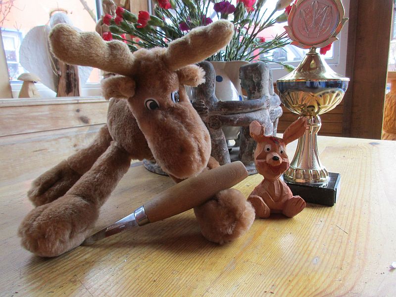 Den Elch, das Schnitzmesser und den kleinen Pokal wurde mir für meinen kleinen Hasen verliehen und habe für das kommende Jahr eine Einladung bekommen. Im Sägewettbewerb bin ich leer ausgegangen.