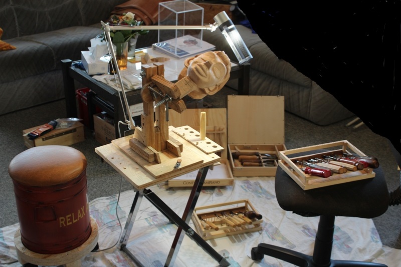 Auch Musste meine "Profiwerkbank" fürs Grobe inzwischen dem Schnitzgalgen weichen. Meine Frau freut sich, wieder bischen mehr Platz im Wohnzimmer