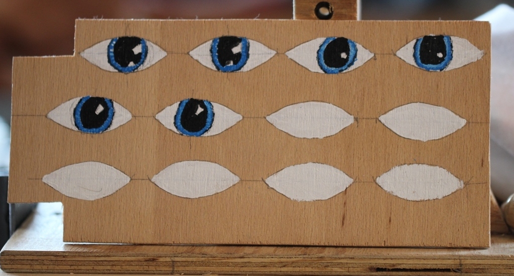 Die Augen werden auch aus Acryllack wegen dem Glanz und der Deckung, die Augäpfel hab ich schon zweimal weiß bemalt. Dazu hab ich noch ein Brettchen mit 12 weißen Augenpaaren bemalt um Muster zu malen.