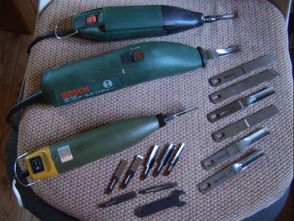 das mittlere Gerät ist ein Schaber vom Bosch, PSE180, dafür gibt es Schnitzzubehör: