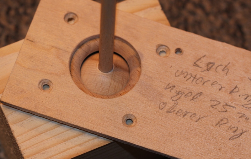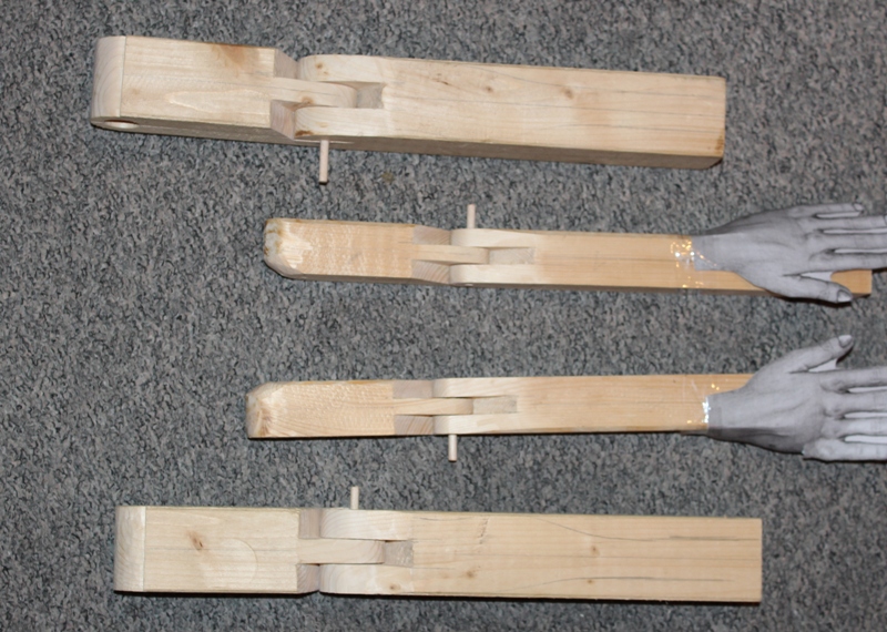 Das Schultergelenk hat mich etwas Gehirnschmalz gekostet da ich keine Metallhaken verwenden wollte, aber ein Kugellager muß ja auch nicht zwingend aus Metall sein, also aus Holz konstruiert - Passt.