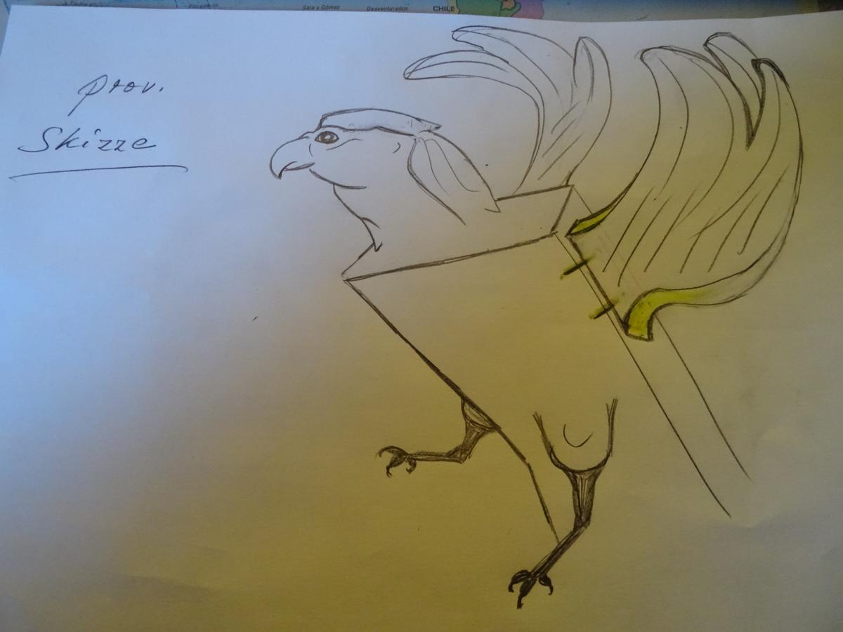 Nachtrag : Kann man nicht auch die Flügel als groben Klotz schon vorher auf die glatte Fläche andübeln - ohne zu verleimen - und dann erst wieder weiterschnitzen ? könnte mir vorstellen , daß da bessere Übergänge vom Flügel zum Körper möglich wären ??? ( siehe Schmierskizze )