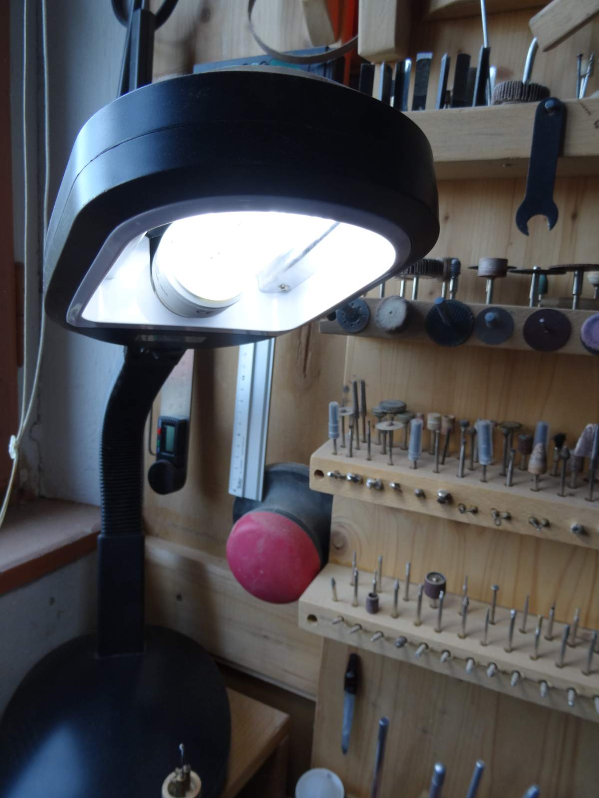 ) Trotz eines Fenster und Tür mit Lichtausschnitt, brauche ich auch künstliche Beleuchtung. So habe ich über der Hobelbank ein- mal Halogenspots und die Gelenklampe mit Energiespalampe. Falls ein Leuchtmittel ausfällt, wird es durch LED ersetzt. Als Deckenbeleuchtung einen Einbaustrahler mit LED- Leuchtmittel und eine Leuchtstofflampe. Zusätzlich ist da noch eine ausziehbare Halogentischleuchte. Im Gegensatz zu meinen Vorrednern tendiere ich zu einer Mischung aus kaltem und warmen Licht. Es ist auf jeden Fall weniger schädlich für die Augen. Ich habe 20 Jahre im Baumarkt hinter mir, darum weiß ich wovon ich rede