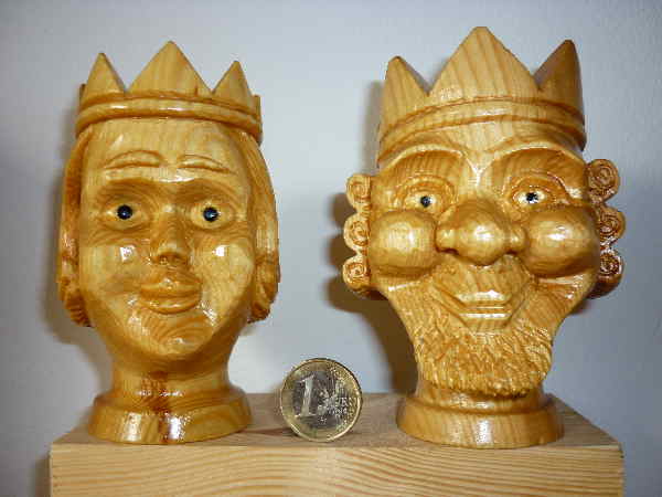 Königin und König dürfen in einem vollständigen Schauspiel-Ensemble natürlich nicht fehlen. Also habe ich auch diese beiden Puppenköpfe aus Kiefernholz geschnitzt. Nur die Königinnen-Krone fand ich unpassend. Kein Problem, so viel künstlerische Freiheit muß man sich schon nehmen um das anders zu machen. Außerdem fing ich an, mit der Lage der Holzmaserung in den Puppengesichtern zuspielen. Beim König ganz frontal, bei der Königin leicht verdreht. Ich wollte einfach ausprobieren wie das wirkt.