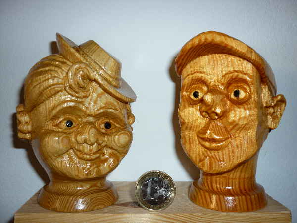 Beide Köpfe sind wieder aus Kiefernholz, aber diesmal habe ich die Faserrichtung der Trude bewußt ca 90Grad verdreht. Ich wollte einfach mal sehen wie das wirkt. Auf Trudes einem Bäckchen ist dabei ein runder Jahresring des Holzes erschienen.