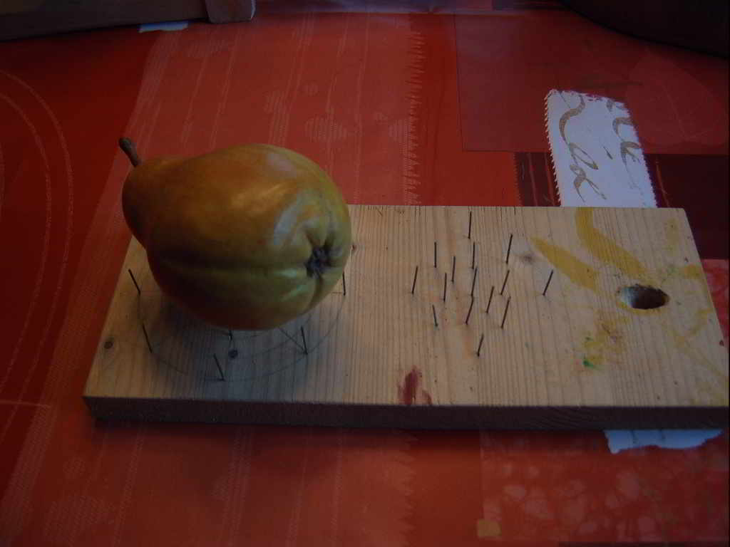 Die Zitrone z.B. ist mit einem abgewinkelten Zimmermannsnagel bearbeitet, damit sie diese Struktur bekam.