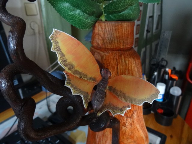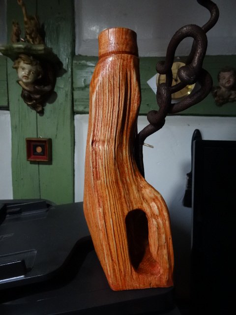 Lasieren auch auf Ölfarbentechnik ist ganz einfach . Ich habe hier noch eine Vase , wiederum aus einem Brennholzstück gefertigt . Ein kleiner Ast vom Korkenzieher - Haselnuß und ein Schmetterling sollen das Ganze