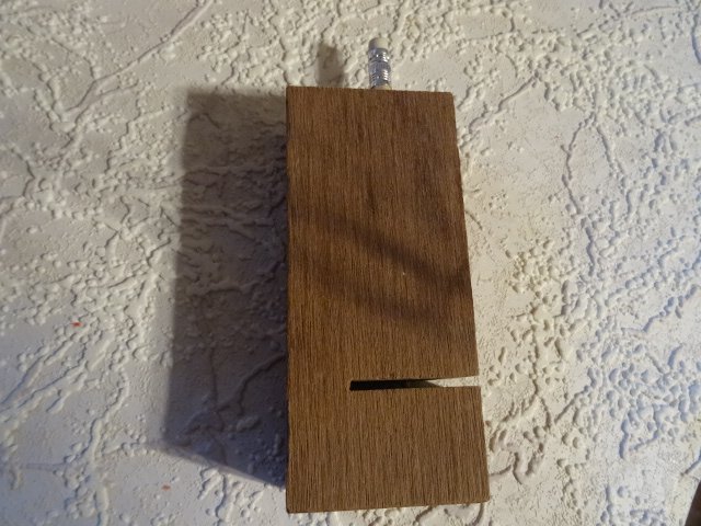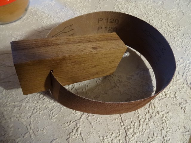 So habe ich z. B. zwei Schleifmaschinen - siehe Bild - dafür kaufe ich billig die breiten Bänder und schneide sie schmal . Hierfür ist das Anreißholz mit dem eingebauten Bleistift gedacht , so schneide ich mir " am Strich entlang "