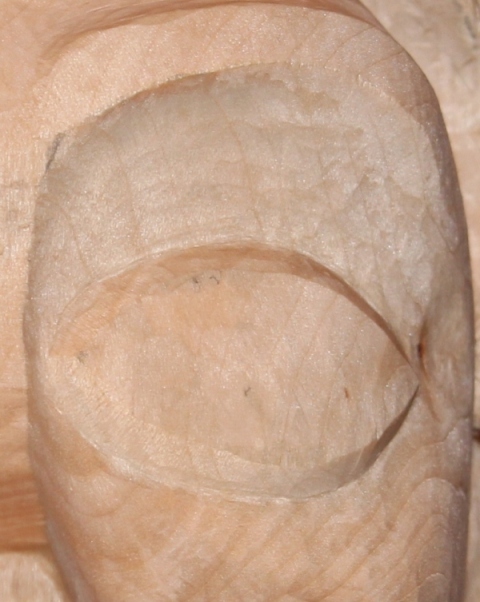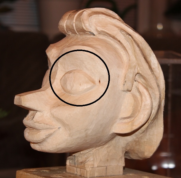 Ich hab jetzt die Augen so gut es ging korrigiert ohne das sie zu klein werden. Den Umriss vom ilnken Auge mit Umfeld hab ich soweit mal fertig geschnitzt und hab dazu eine Frage an Euch, genügt es so oder sind zu viele Schnitzmarken vorhanden bzw. nicht sauber genug ausgeschnitzt ? Da die Kolorierung später so sein soll das die Maserung noch gut sichtbar ist und ich nur Erfahrung im beizen von geschliffenen Oberflächen ( früher Treppenbau ) habe.