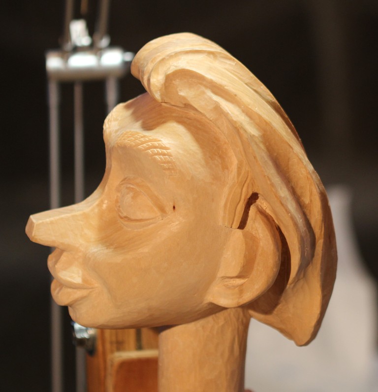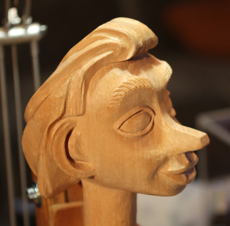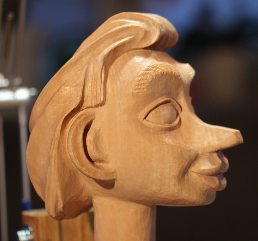 So, der Kopf ist fertig geschnitzt. Die Nase und Ohren könnte man noch verfeinern aber ich lass es bewusst so da ja der Pinocchio eine zum Mensch werdende Marionette darstellen soll.